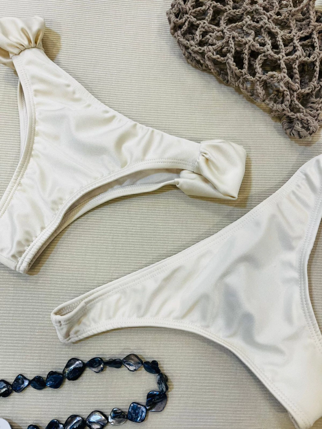Bikini color blanca con un diseño elegante y sofisticado. El corpiño es modelo triángulo con galones dorados, que aportan un toque de brillo y distinción, acompañado de breteles finos con detalles en nudos. Su tono cálido realza el bronceado y combina perfectamente con el estilo veraniego.