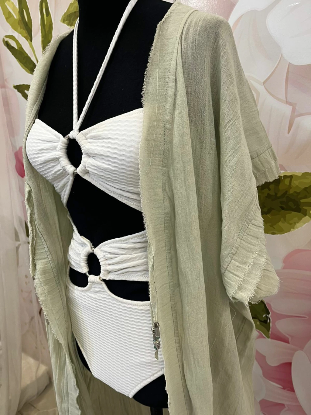 Camisola de playa en tono verde agua, confeccionada en una tela liviana y fresca, ideal para el verano. Presenta mangas cortas con terminaciones desflecadas en los puños que le aportan un aire relajado y bohemio. Su diseño es largo, con tajos a los costados que le dan movimiento y comodidad al andar. Como detalle distintivo, cuenta con dijes colgantes en los extremos, que suman un toque delicado y femenino. Una prenda versátil y elegante para complementar looks playeros con estilo.
