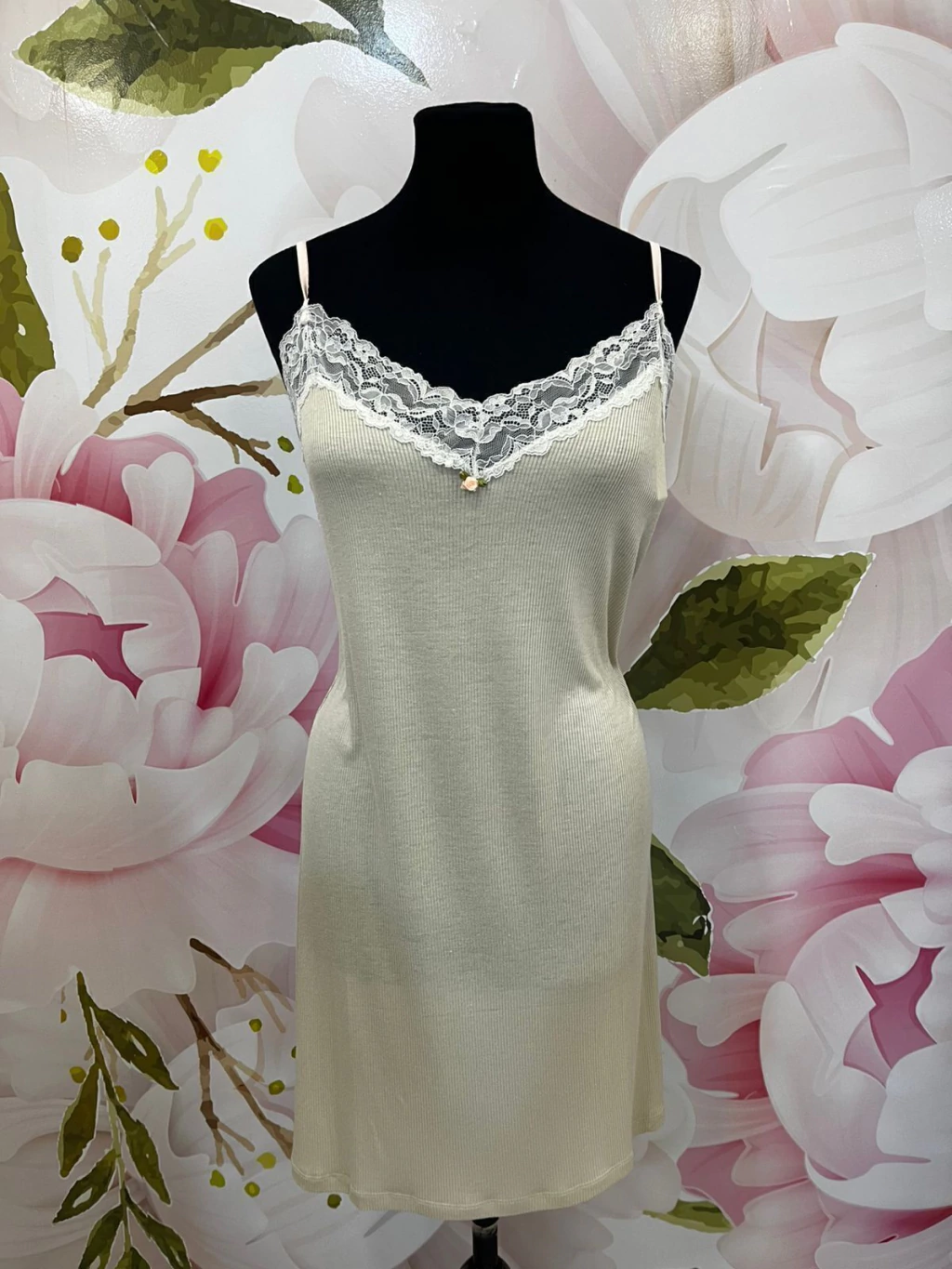 Este camisolin de morley color beige combina comodidad y delicadeza en un diseño femenino y elegante. Presenta un escote en V adornado con puntilla en tono rosa suave, que resalta con un aire romántico y sutil. Sus breteles finos regulables permiten un ajuste perfecto al cuerpo, adaptándose a la silueta con naturalidad. El tejido de morley le da una textura ligera y elástica, ideal para aportar frescura y confort. Una prenda versátil que puede usarse tanto para dormir como para estar en casa con un estilo refinado y delicado.