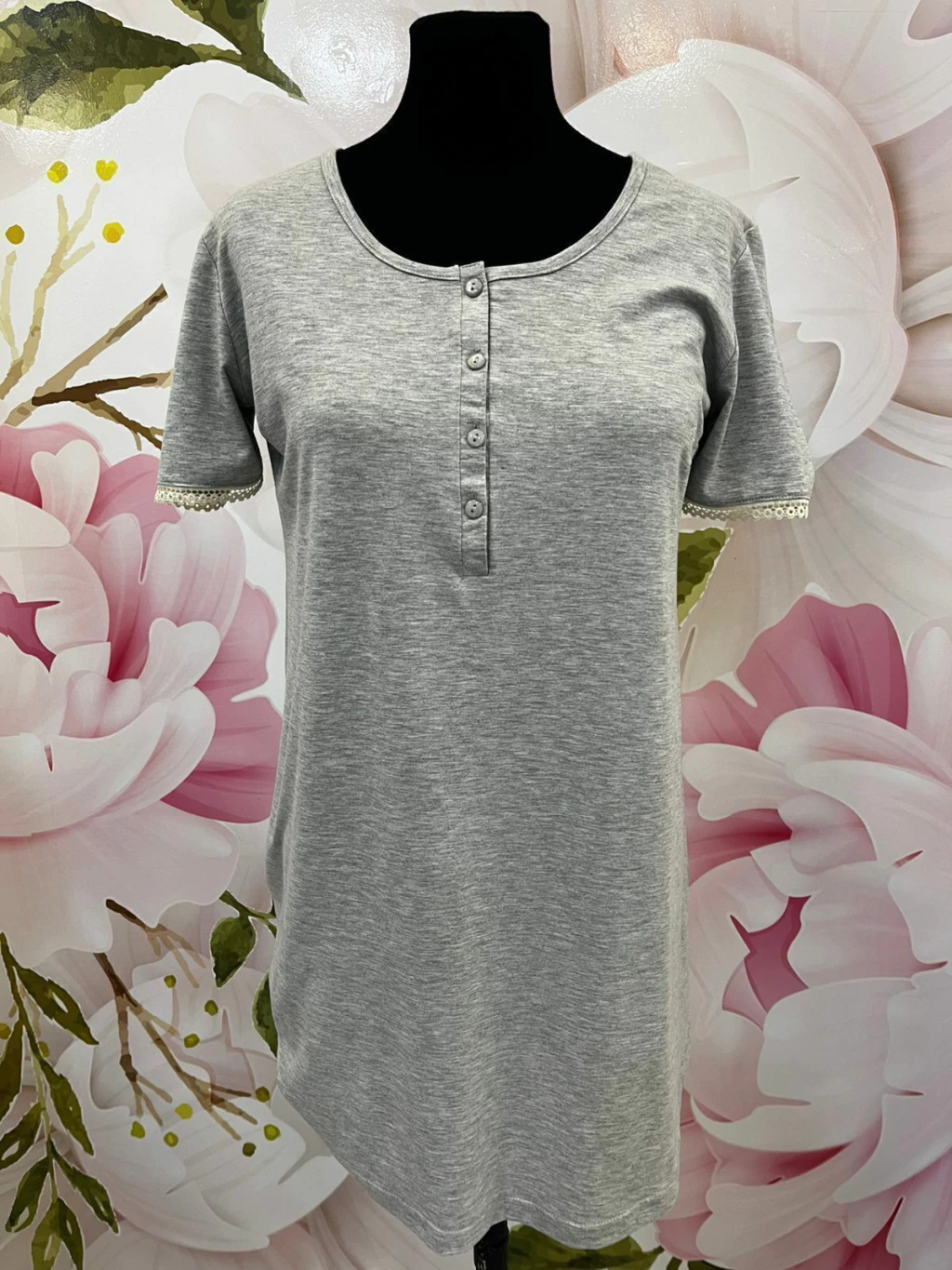 Camisón de algodón en color gris, de manga corta y corte recto, ideal para brindar comodidad y frescura en el descanso. Presenta un escote redondo con tapeta de botones al frente que suma practicidad y un detalle clásico al diseño. Las mangas están terminadas con un delicado borde de encaje, que le aporta un toque femenino y sutil. Una prenda simple, suave y funcional, pensada para acompañar con estilo las noches de relax.