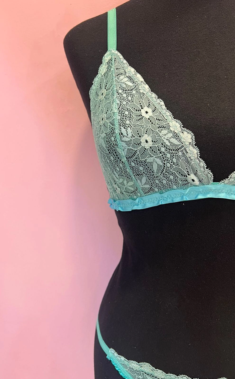 Este conjunto de lencería está confeccionado en encaje color verde esmeralda, con un diseño delicado y femenino. El corpiño estilo triángulo no posee aro ni relleno, lo que lo hace liviano y cómodo, y se ajusta con breteles de cinta satinada para un calce regulable. La base está decorada con un detalle fruncido en satén al tono que le aporta un acabado romántico y distintivo. La colaless combina transparencia y bordado floral en encaje, con laterales finos y elásticos que realzan la silueta de manera sutil y sensual. Un conjunto fresco, sofisticado y con un encanto delicado.