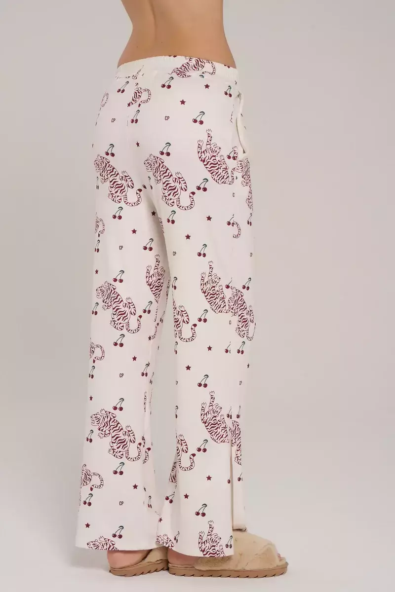 Remera manga corta escote redondo, confeccionada en modal estampado + Pantalón semi oxford con cintura elastizada, bolsillos laterales y tajos en el ruedo. Confeccionado en modal estampado