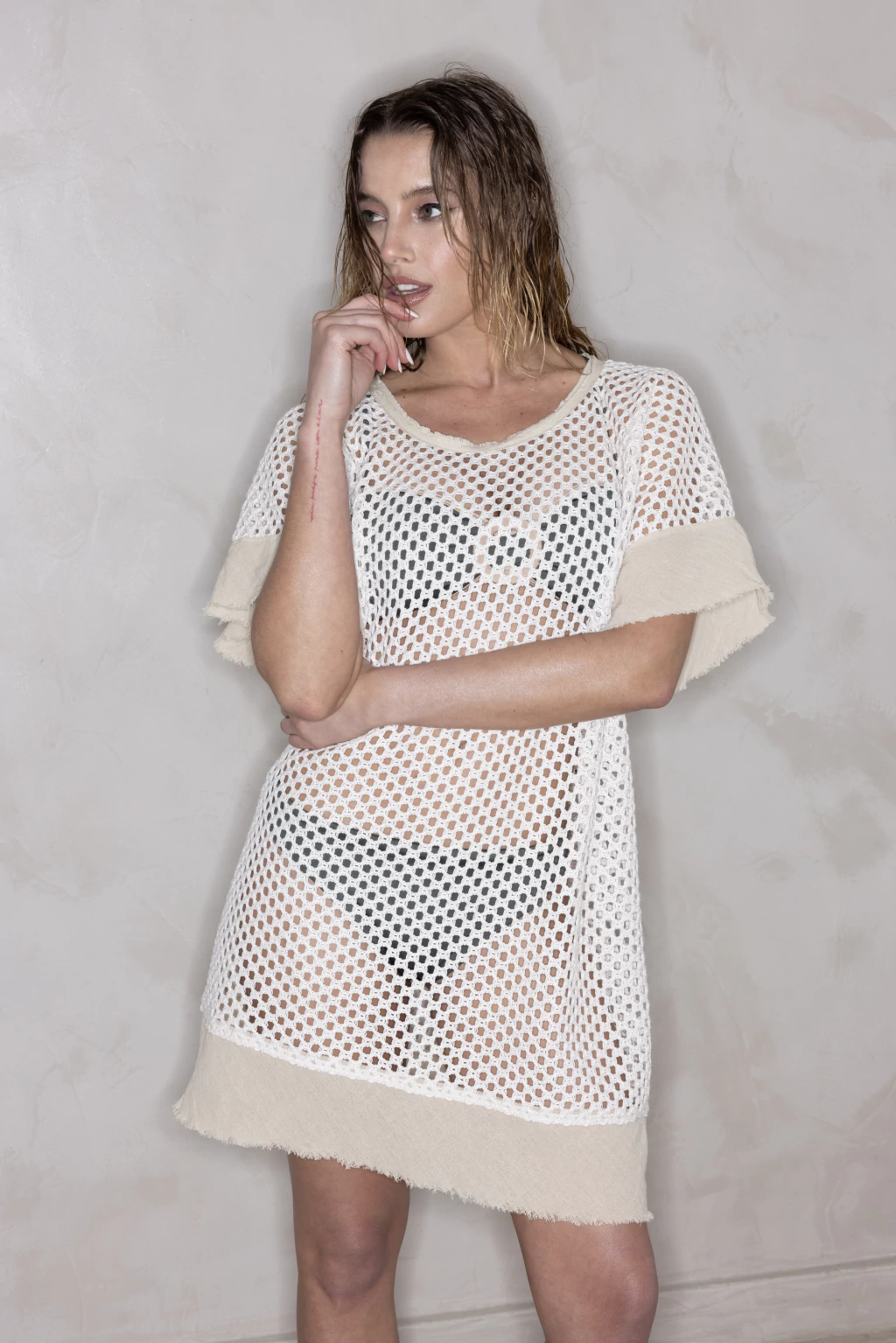 Remerón/vestido playero de red en color arena, ideal como salida de playa práctica y con estilo. Su diseño holgado y fresco está confeccionado en malla abierta que permite lucir el traje de baño con un aire moderno y descontracturado. Presenta mangas cortas con terminaciones en tela compacta al tono y dobladillo inferior en contraste, que aportan un detalle diferenciado. Una prenda versátil, cómoda y chic para completar tus looks de verano.