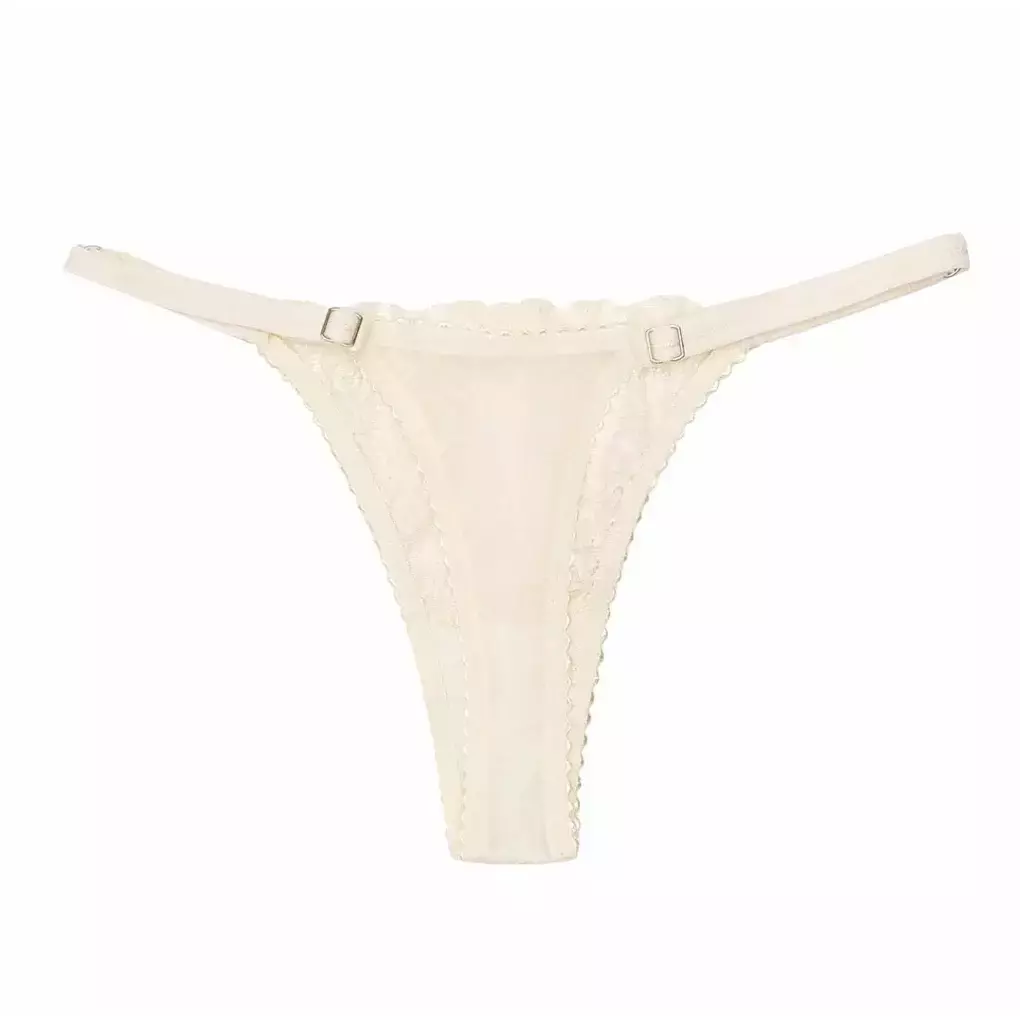 La bombacha cuenta con detalles de puntilla fina rígida en los inicios de breteles. Tiene un detalle central de una mariposa como decoración. Trasero less de denier.
